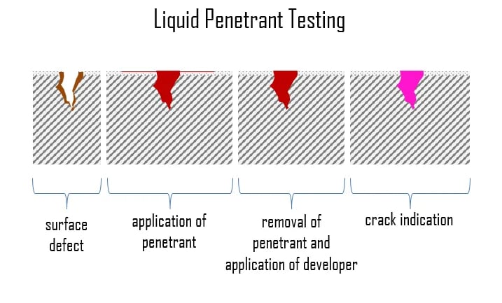 Liquid Penetrant Testing là phương pháp dùng để phát hiện các khuyết tật mở ra bề mặt như vết nứt, rỗ hoặc lỗ kim trên vật liệu kim loại và phi kim. Kỹ thuật viên sẽ bôi một loại chất lỏng đặc biệt (có chứa thuốc nhuộm màu hoặc huỳnh quang) lên bề mặt vật cần kiểm tra.