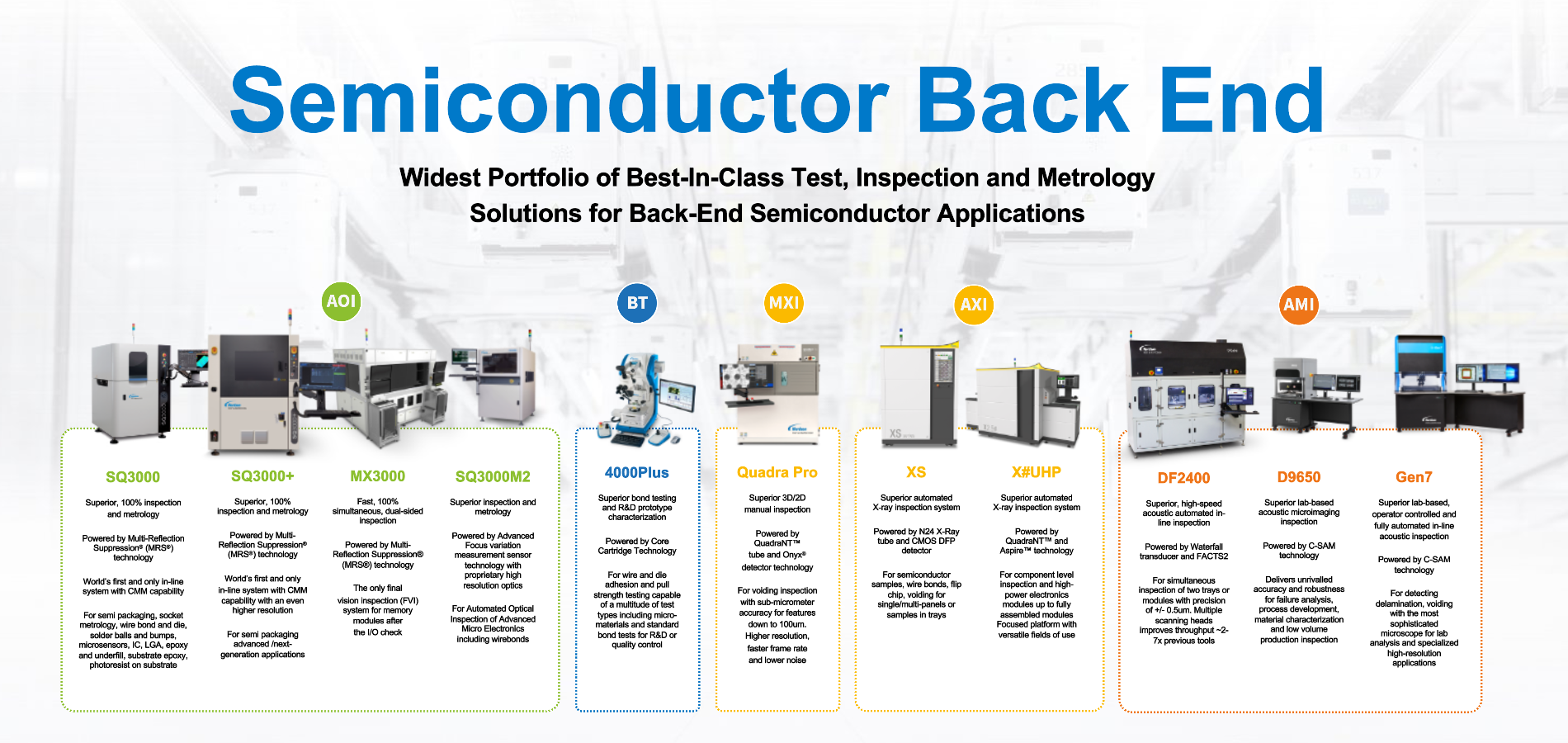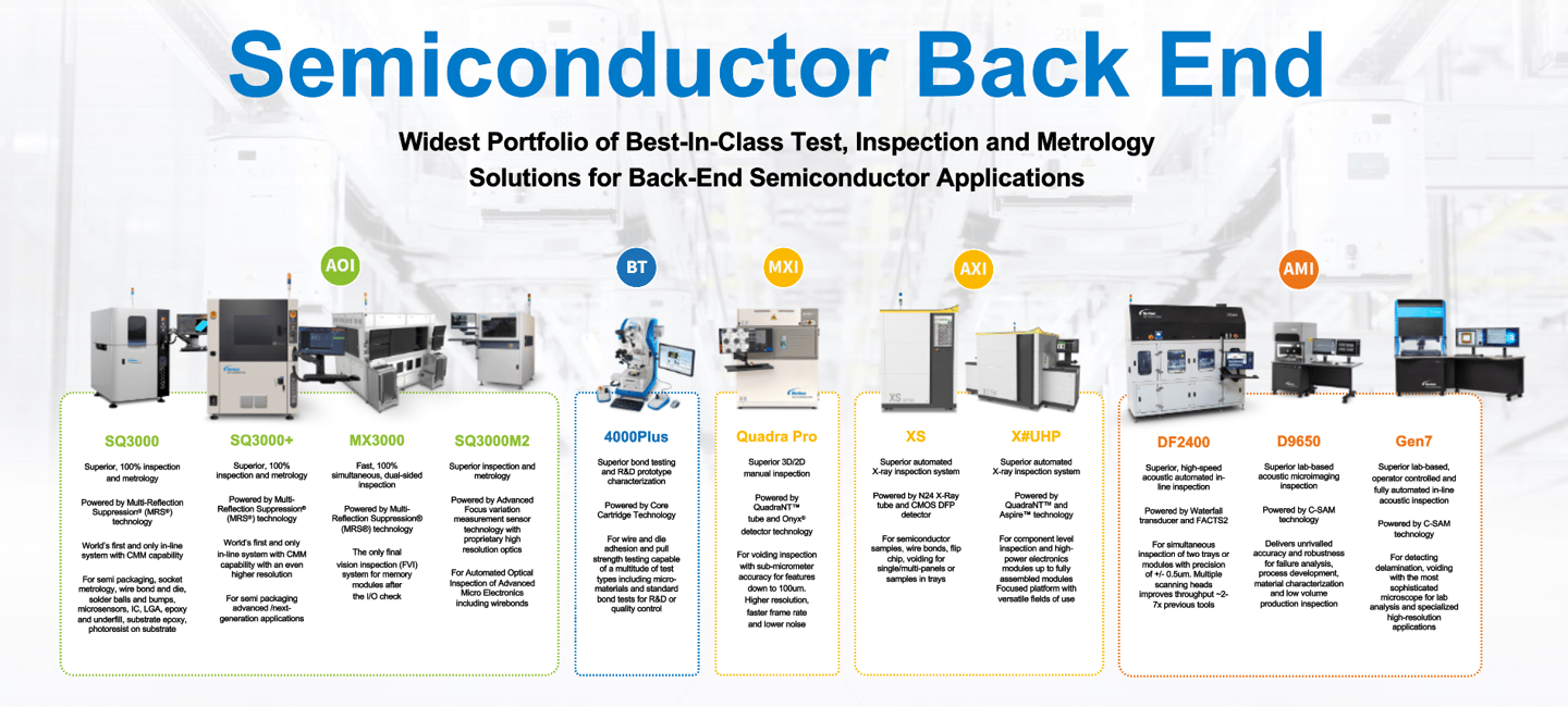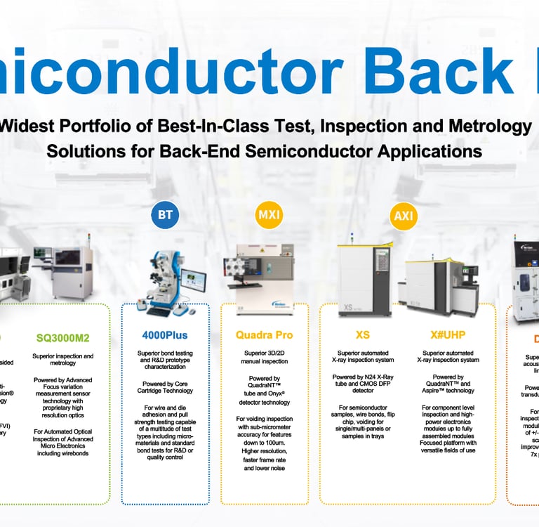 Giải pháp Toàn diện: Nordson cung cấp một danh mục sản phẩm kiểm tra hoàn chỉnh, bao gồm AXI, AOI (Quang học), AMI (Âm học), và Bondtesters (Kiểm tra độ bền liên kết).