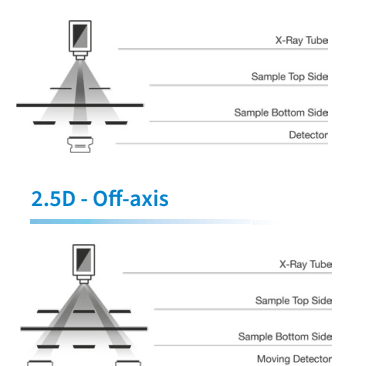 2D (Transmission): Đây là kỹ thuật chụp X-ray truyền thống, chiếu thẳng qua bo mạch. Đây là kỹ thuật nhanh nhất (lên đến 5-6 hình/giây). Vấn đề trên các bo mạch 2 mặt (double-sided), hình ảnh linh kiện ở mặt trên và mặt dưới sẽ bị xếp chồng (overlapping) lên nhau, gây khó khăn cho việc kiểm tra.
