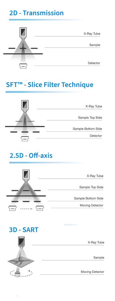 3D SART / Dynamic Planar CT: Đây là công nghệ 3D (Tomosynthesis) cao cấp, tạo ra nhiều lát cắt ngang qua linh kiện. Đây là phương pháp đáng tin cậy nhất để kiểm tra các bo mạch 2 mặt có mật độ linh kiện dày đặc, các module đa chip (MCM), tách biệt hoàn toàn các lớp để đánh giá độc lập.