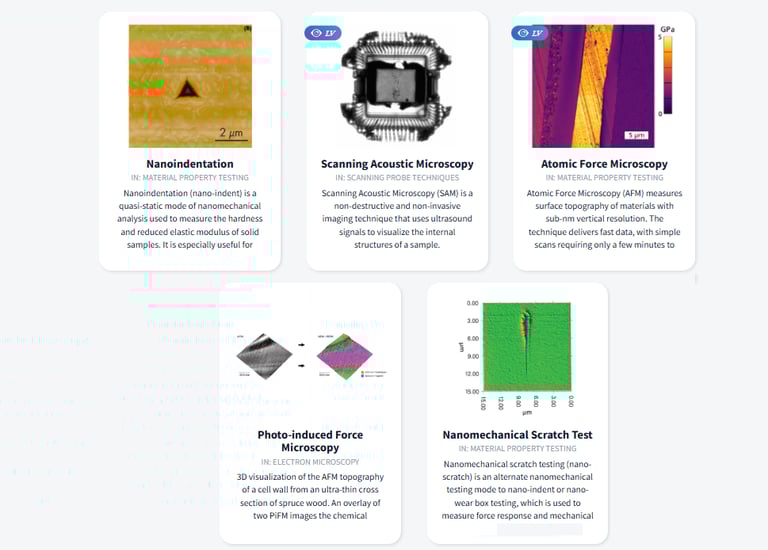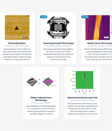 Dịch vụ Scanning Probe cung cấp các giải pháp đặc trưng bề mặt và tính chất cơ học ở cấp độ nano, sử dụng các kỹ thuật AFM, PiFM, Nanoindentation, Nano-scratch và SAM. Hệ thống cho phép đo địa hình bề mặt, thành phần hoá học cục bộ, độ cứng, mô-đun đàn hồi, độ bám dính lớp phủ và cấu trúc bên trong một cách không phá huỷ, độ phân giải nano, phục vụ phân tích lỗi, kiểm soát chất lượng và R&D cho bán dẫn, vật liệu phủ, linh kiện điện tử và vật liệu tiên tiến.