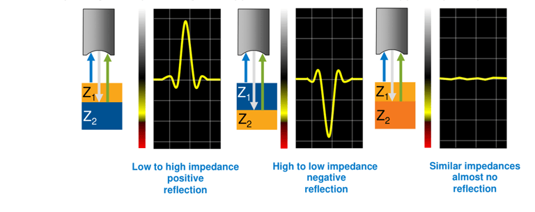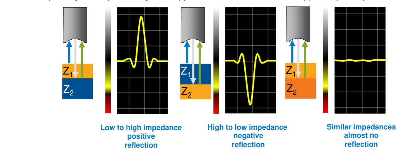 Cường độ và cực tính của tín hiệu phản xạ sẽ phụ thuộc vào mức độ chênh lệch và mối quan hệ (lớn hơn hay nhỏ hơn) giữa trở kháng của tạp chất/vật liệu lạ và vật liệu nền. Ví dụ, nếu một tạp chất kim loại (Z cao) nằm trong nhựa epoxy (Z thấp), tín hiệu phản xạ sẽ có cực tính dương.