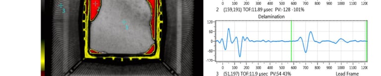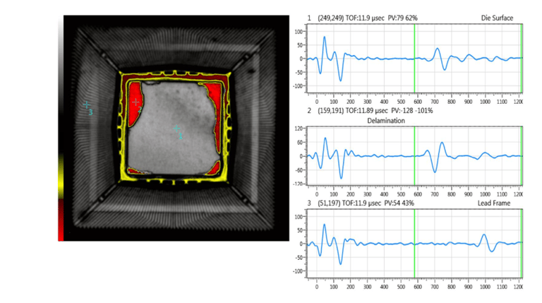 Kết quả trên hình ảnh CSAM/SAT: Trong hình ảnh C-scan chế độ biên độ (amplitude mode), các vùng có khuyết tật chứa không khí này thường xuất hiện rất sáng (ví dụ, màu trắng trên thang độ xám hoặc các màu nóng như đỏ, vàng trên thang màu) do cường độ phản xạ rất mạnh. Phân tích cực tính trên A-scan (thấy xung phản xạ âm) hoặc sử dụng các chế độ hiển thị dựa trên pha (phase imaging) có thể giúp xác nhận chắc chắn bản chất của loại khuyết tật này.